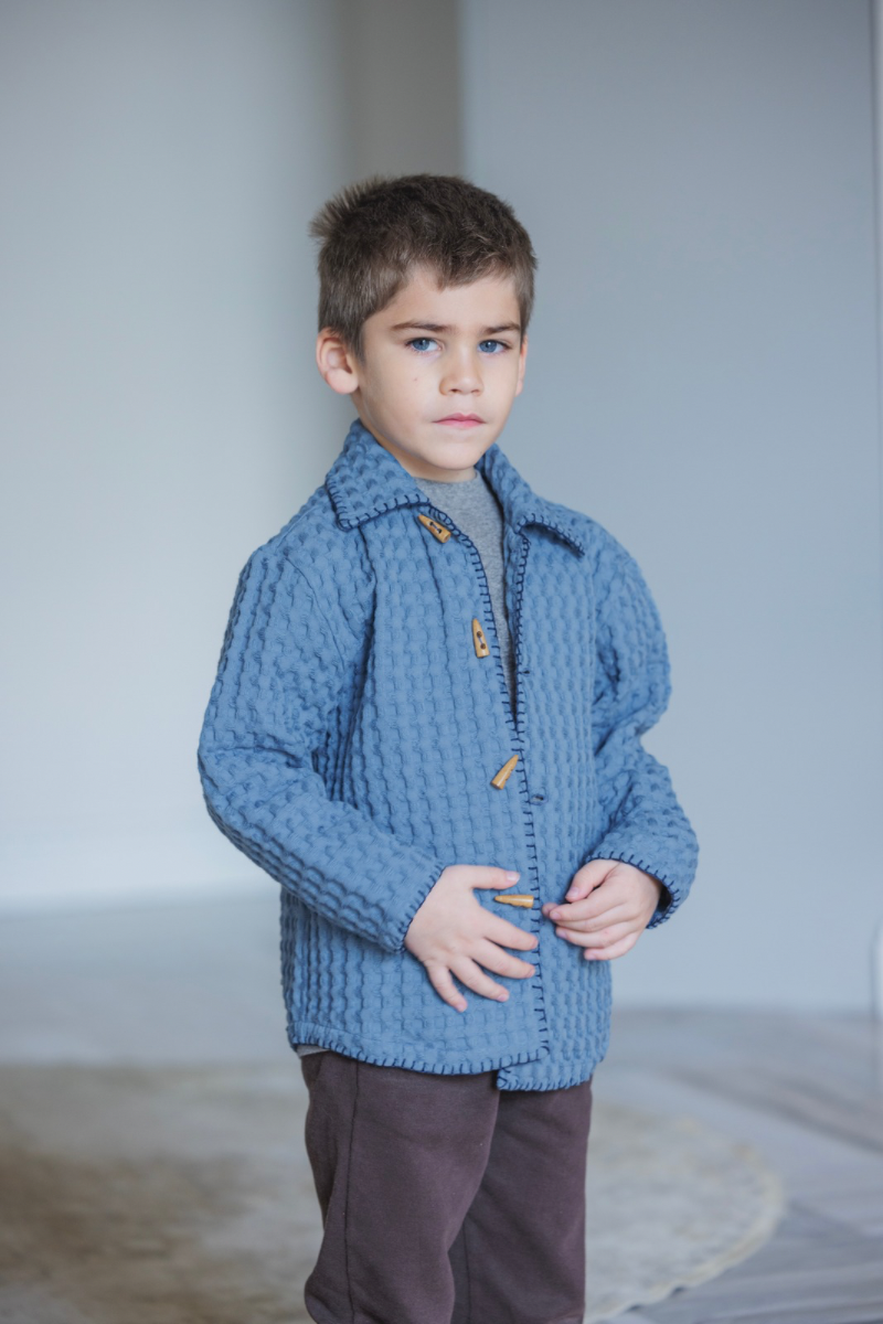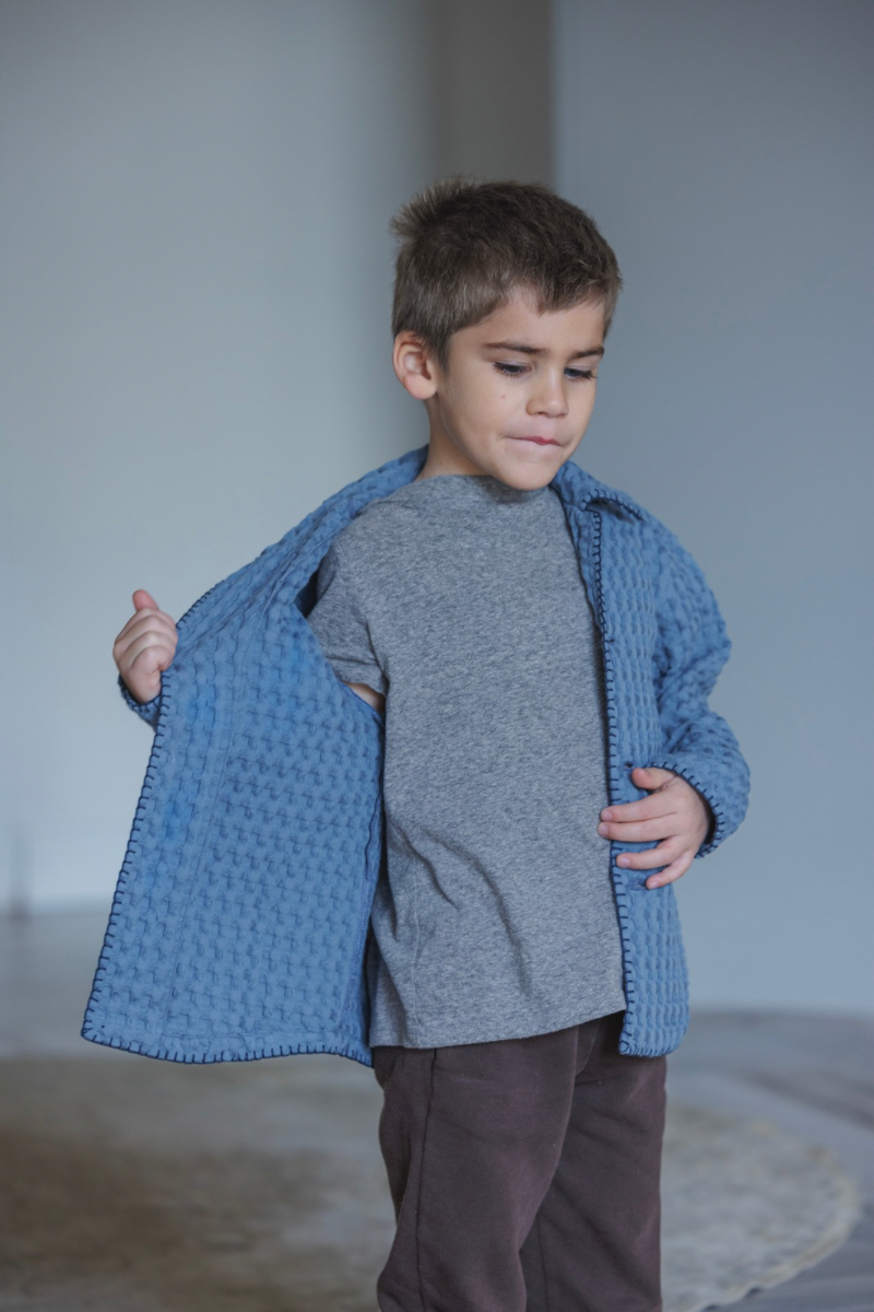 A blue, long-sleeved top for kids with a front closure featuring wooden buttons, navy-colored hemstitched details along the edges, made of 100% cotton—super comfortable and cozy!