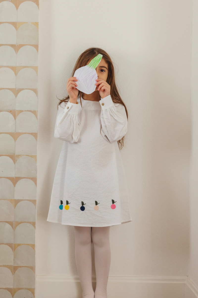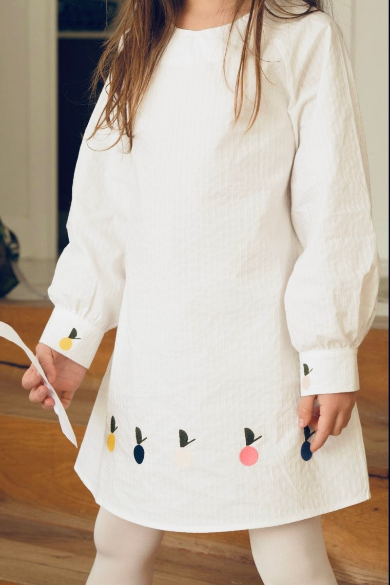 This long-sleeve dress adorned with apple embroidery details is made from 100% cotton.