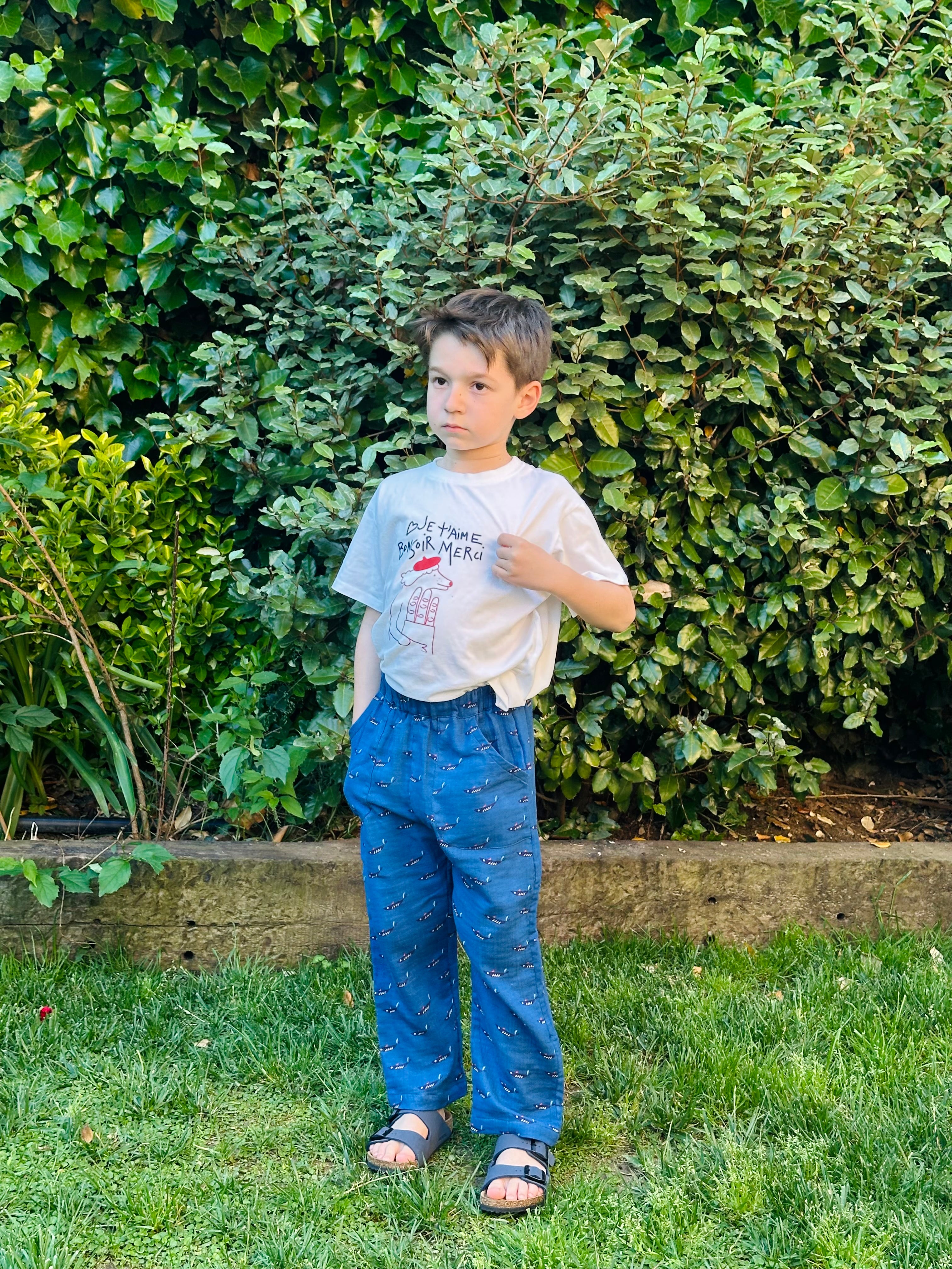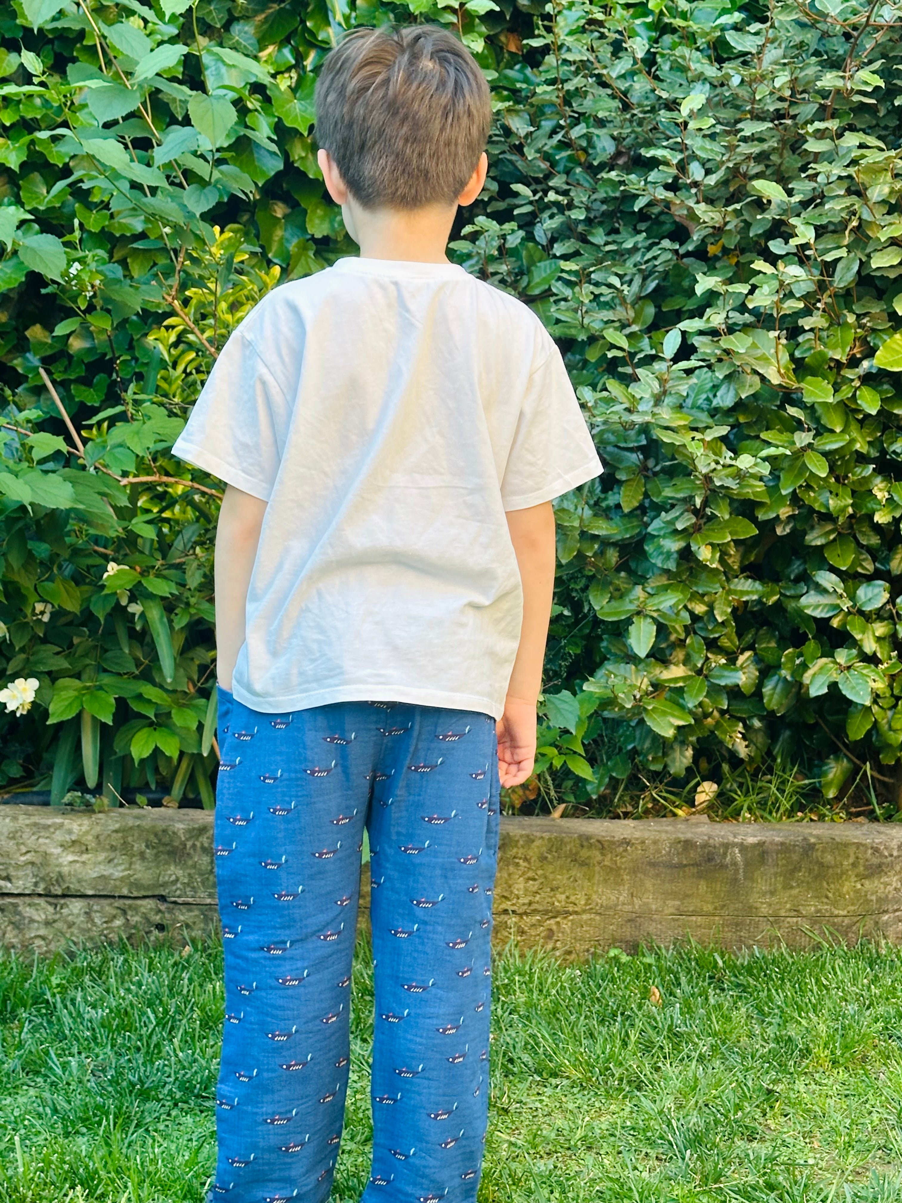 These blue lightweight muslin pants bring a playful touch to any outfit. Made from 100% muslin cotton, they feature a regular crotch, elasticated waistband, and Kisu’s iconic fish prints. Embrace the whimsical charm of our fish design and make a statement whereever you go! 🐟🐠