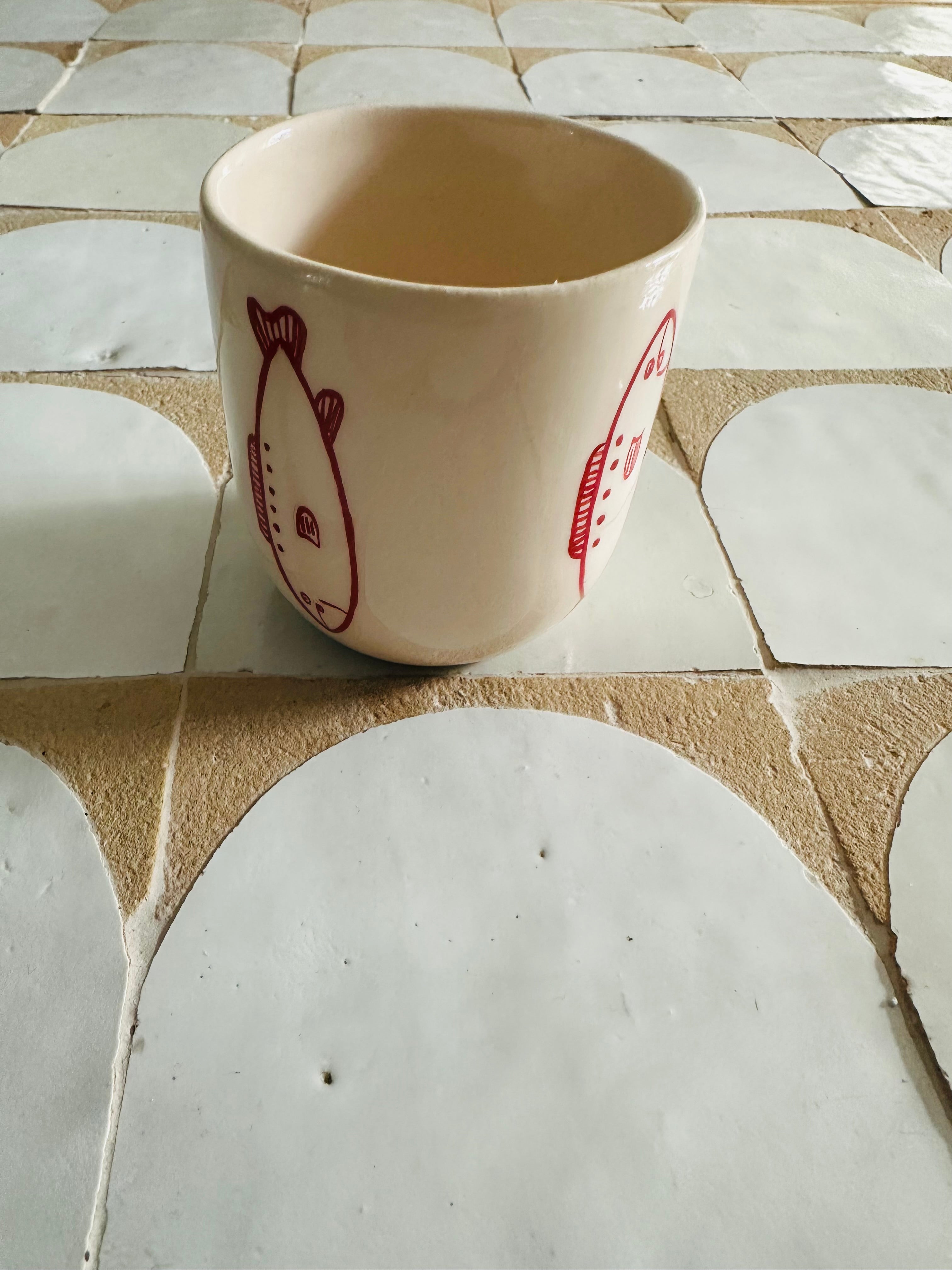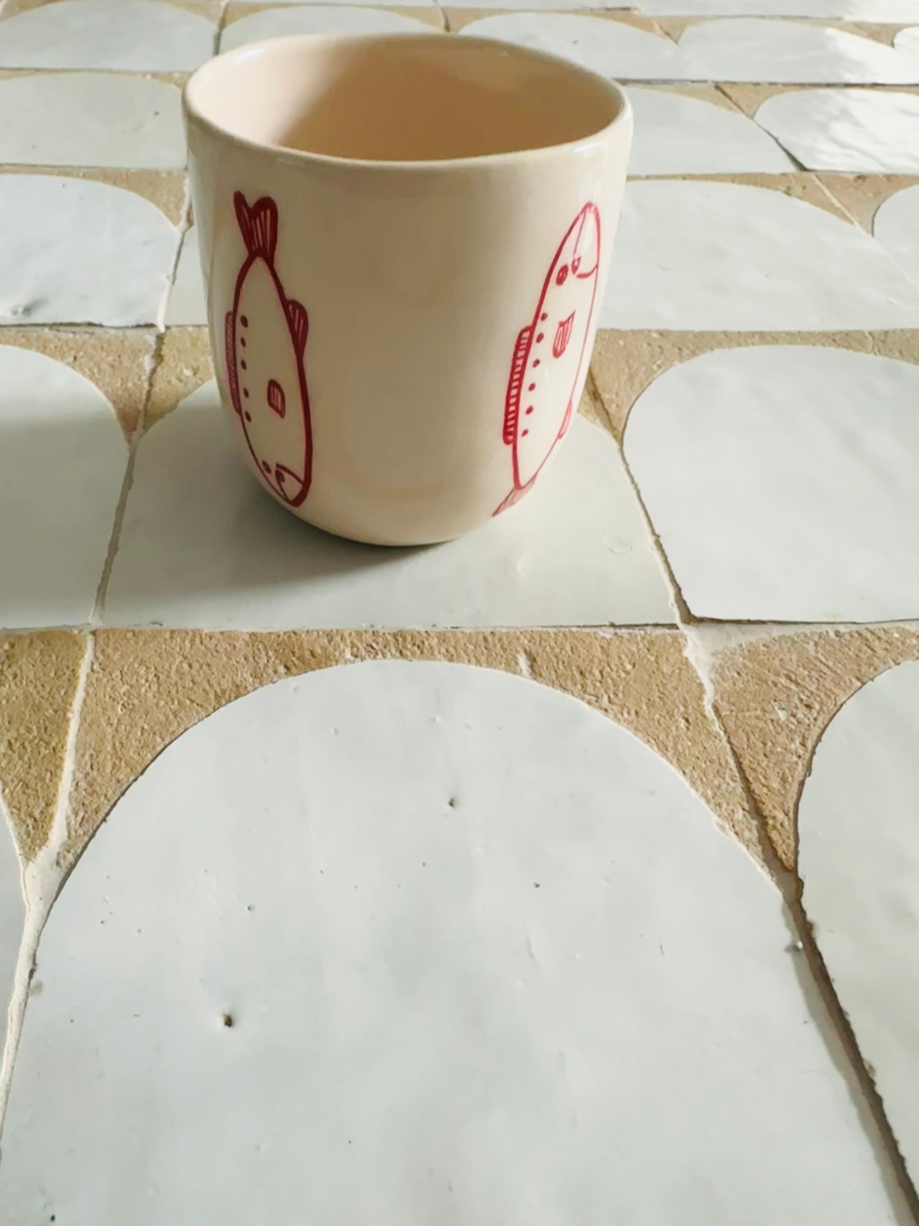 Handmade with care, this ceramic mug brings joy to every sip. Surrounded by playful fish swimming upside down and right side up, it captures the lighthearted spirit of the sea.