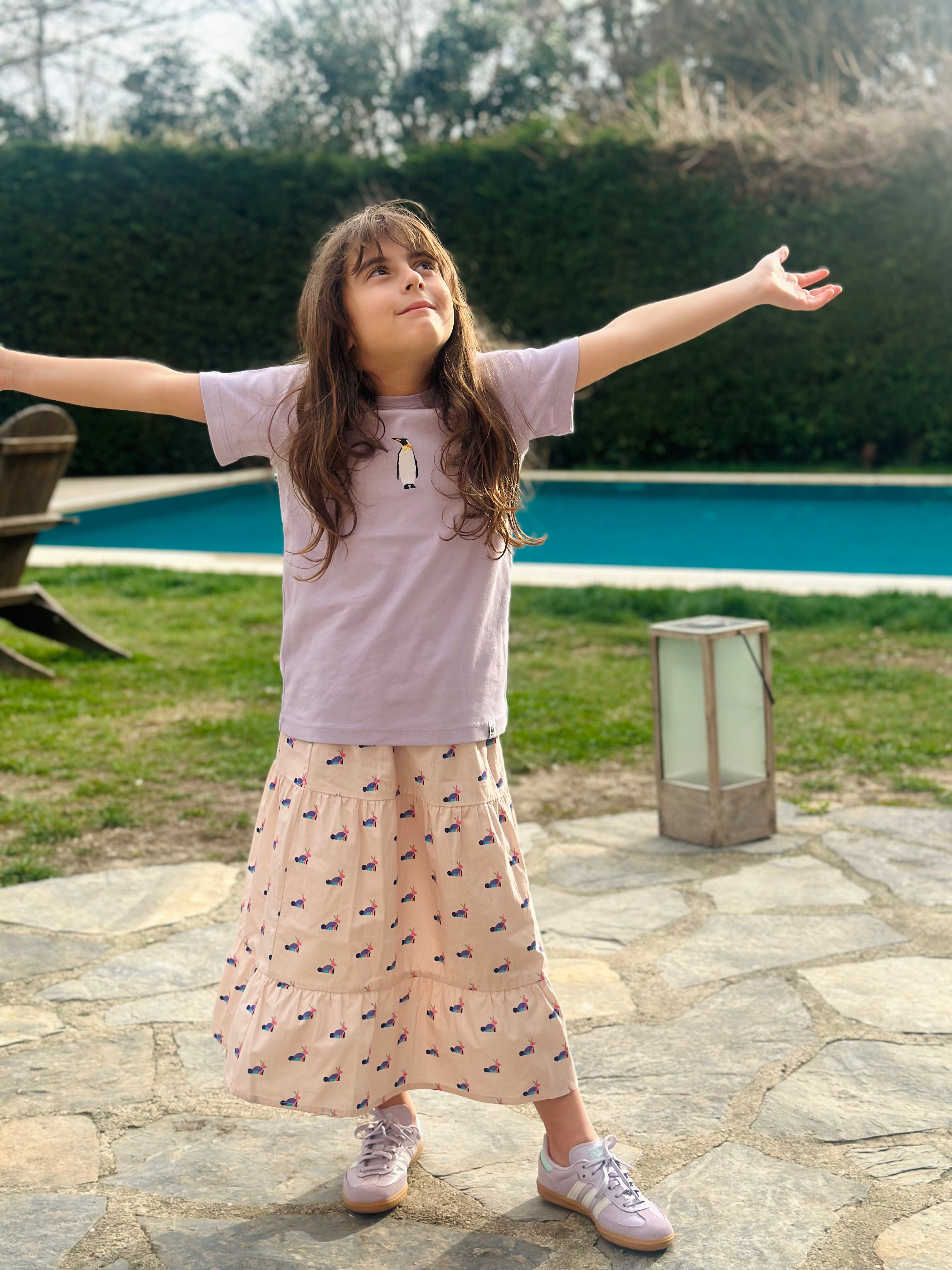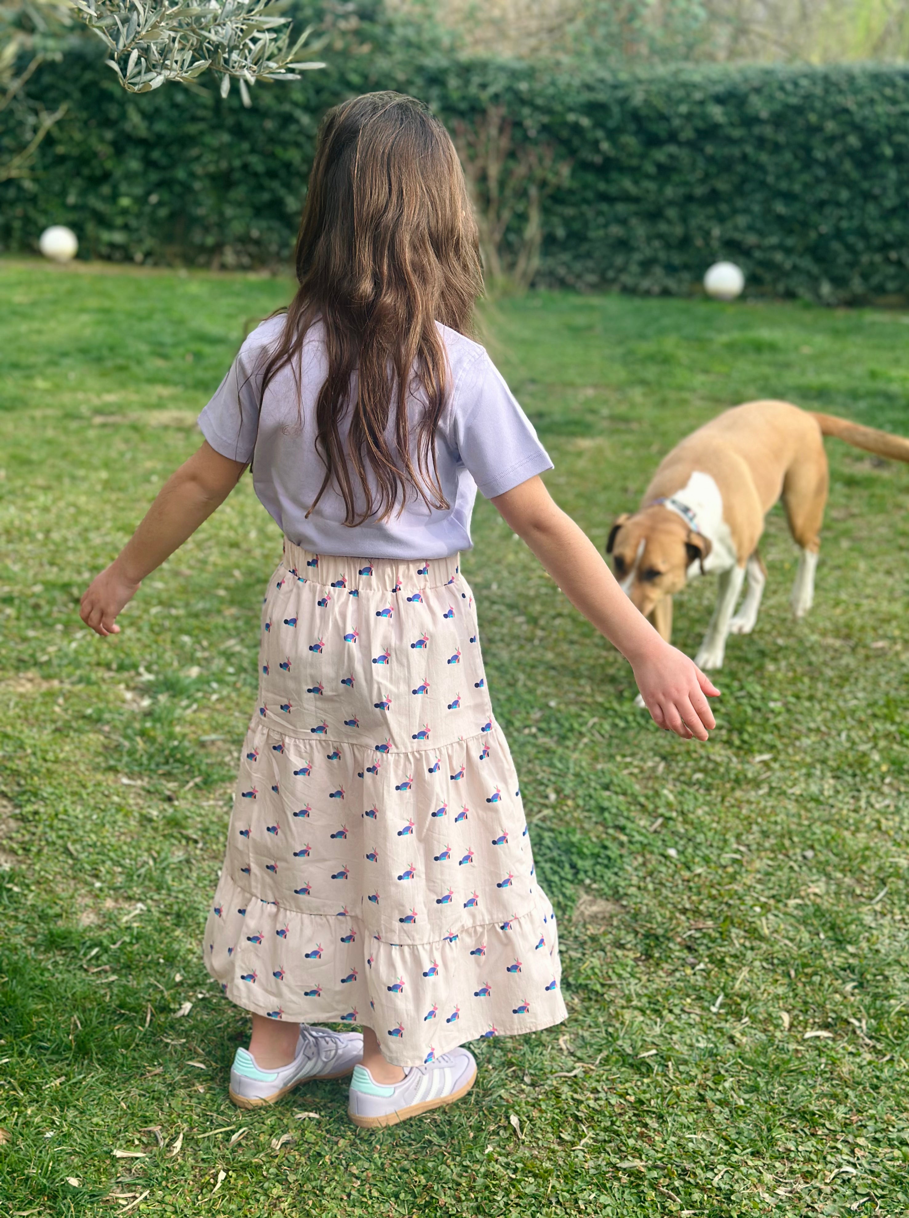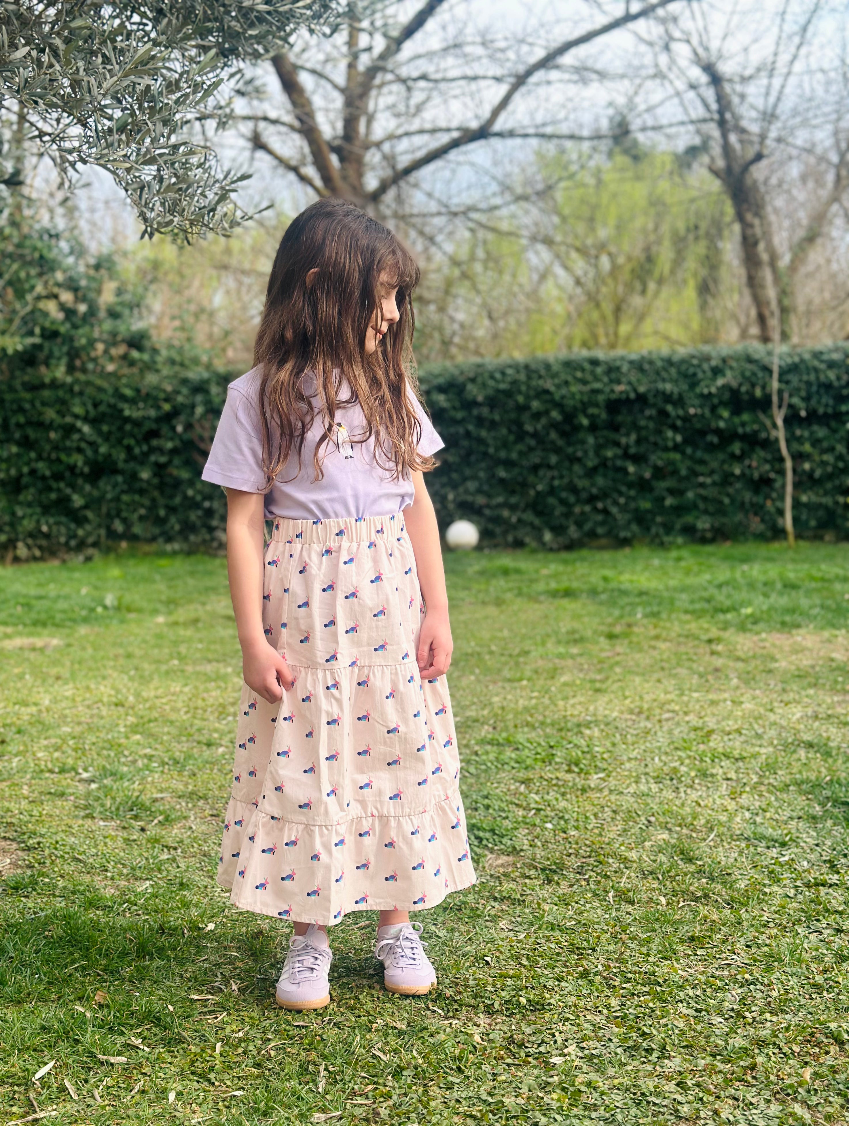 Kisu's Maxi Bunny Skirt for girls! This delightful skirt features a serene salmon pink hue adorned with adorable tiny bunnies, adding a whimsical touch to your little one's wardrobe.