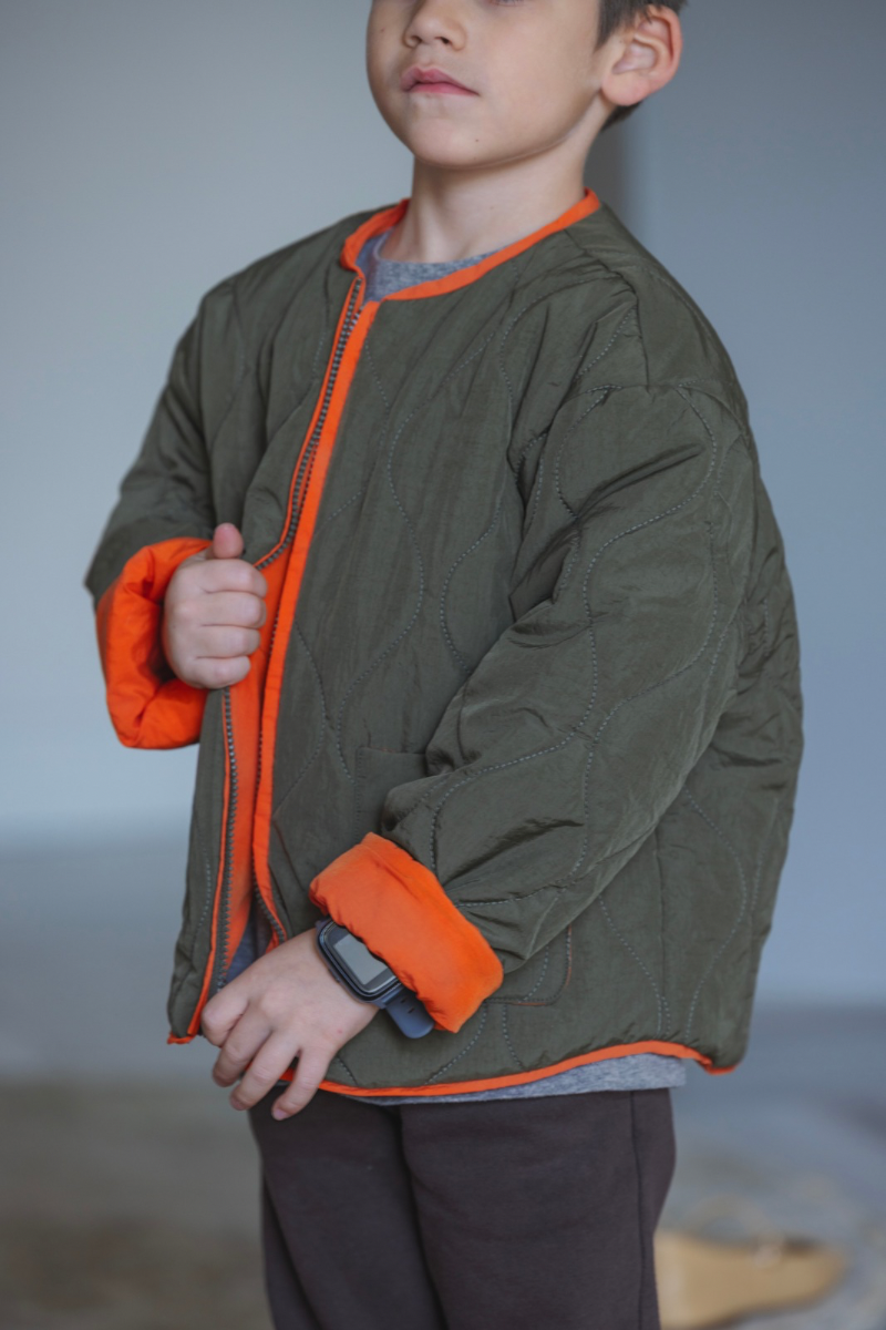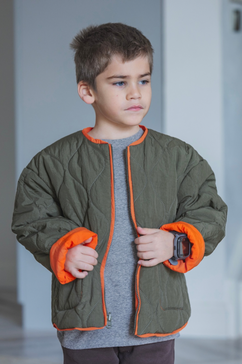 Kisu's Reversible Puffer Jacket! This versatile jacket features a dual-sided design in vibrant green and orange hues, allowing your child to switch up their look effortlessly while staying warm and snug.