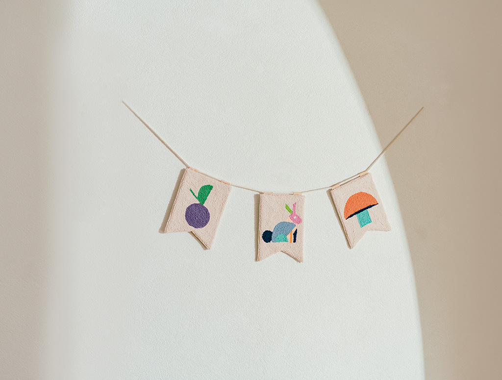 Kisu's Tri-Panel Tufted Wall Flag! This charming flag features three panels of soft, tufted fabric in vibrant colors, adding a playful and whimsical touch to any room.